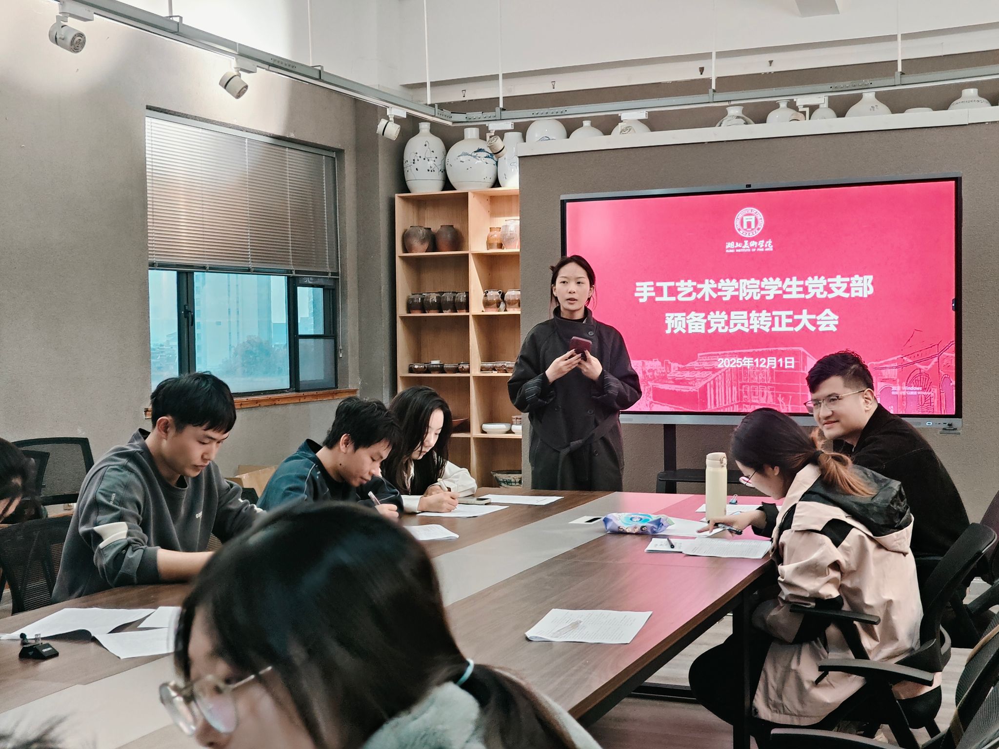 2025年12月1日,手工艺术学院学生党支部召开支部大会,聚焦2025下半年发展对象接收与预备党员转正两项核心任务。支部应到实到人数符合规定,会议由章顺超主持。