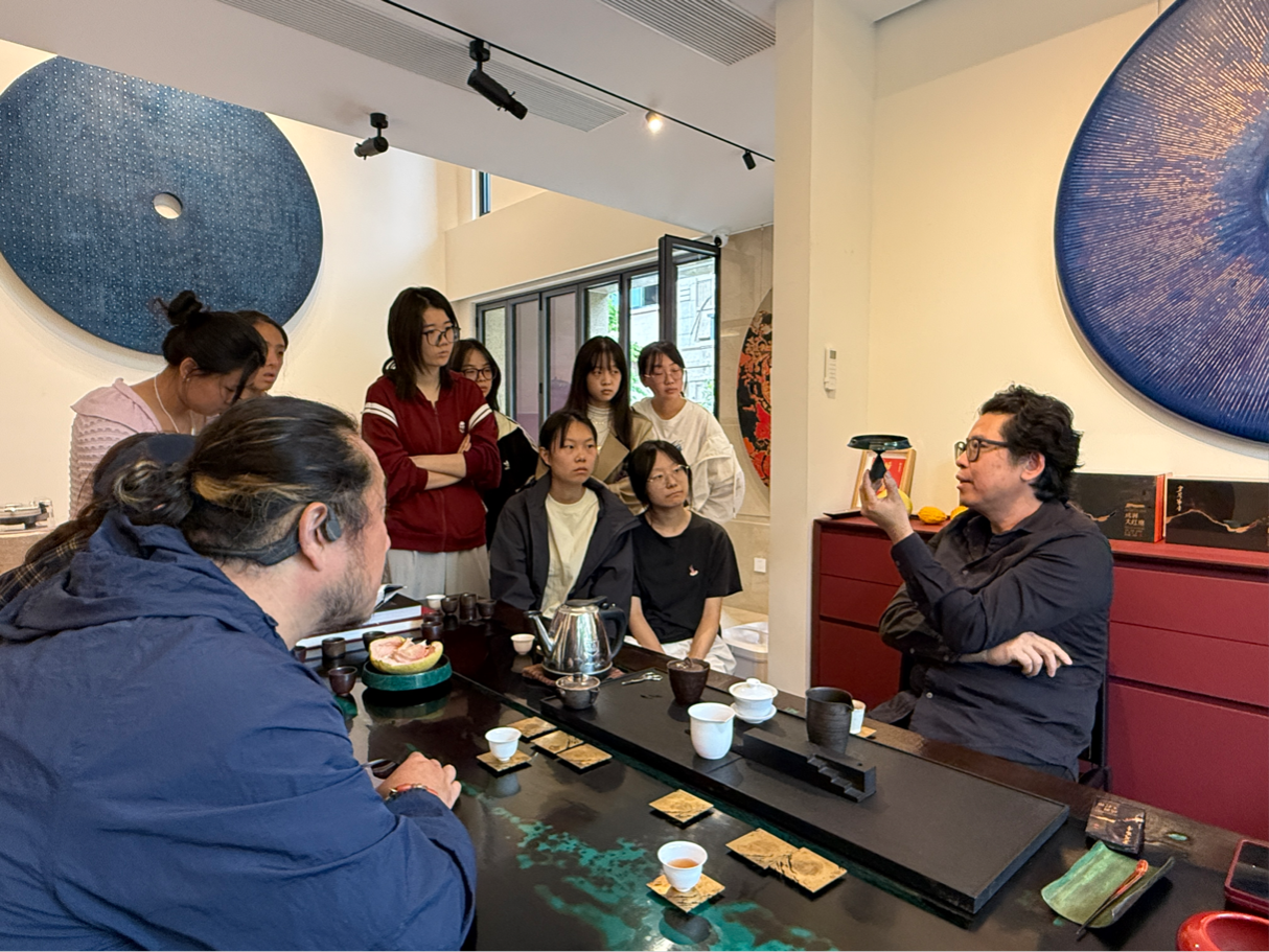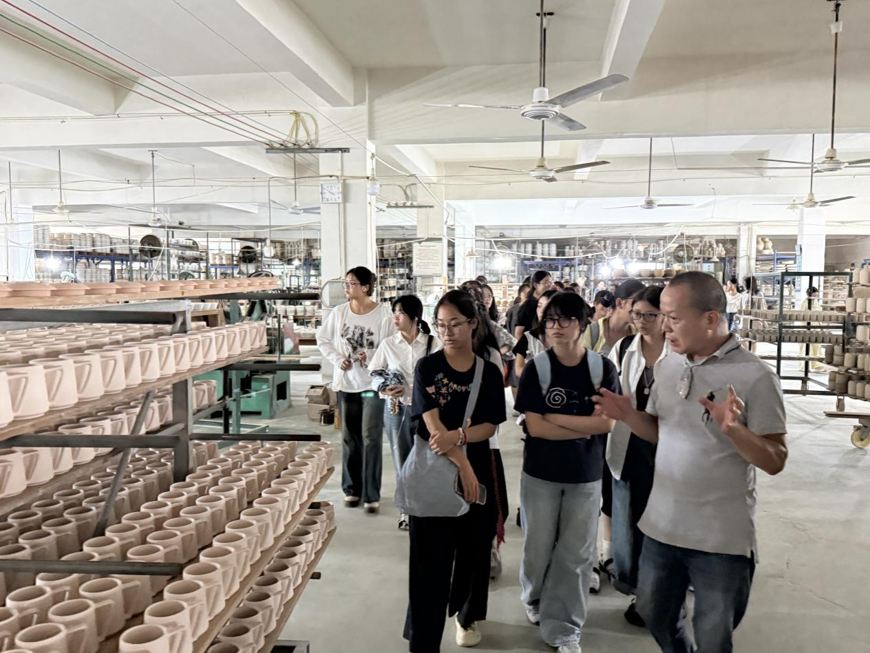 在传统工艺现代化转型领域,考察团深入产业一线。龙泉青创园区内,龙泉青瓷非遗传承人陈均林先生向师生展示“青瓷+家居”“青瓷+灯具”等跨界案例,通过对工厂调研,剖析文创赋能产业升级的路径。德化山花陶瓷董事长、福建省工艺美术大师郑雄文展现了德化陶瓷“中国白”从手工捏塑到智能生产的迭代历程。厦门文创产业园区内,师生与本土设计师就非遗IP开发展开研讨,探索传统纹样在潮玩、服饰等领域的创新表达。