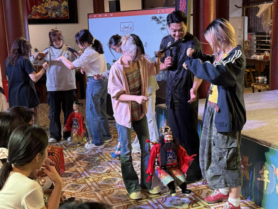 考察团通过手作实践深化非遗理解。在龙泉宝剑锻造坊,非遗传承人江龙演示“锻、磨、淬”百炼成剑的工艺,学生亲手参与剑坯锻打与打磨,体会“百炼钢化为绕指柔”的匠人精神。泉州非遗馆内,南音工坊的吟唱与提线木偶的灵动演绎,让学生感受非遗的活态传承;木偶戏传承人现场教授“提线控偶”技法,将机械传动原理与传统表演艺术巧妙结合。