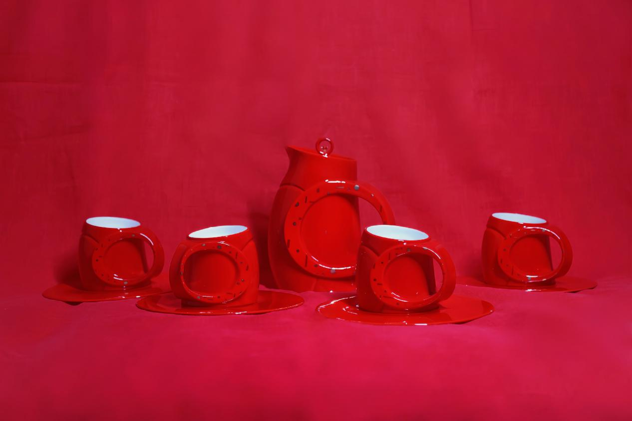 湖北美术学院手工艺术学院教师叶加贝陶瓷设计作品《“红色基因”茶具》获得最佳设计奖(最高奖)。作品以红色釉陶瓷为载体,通过器型设计与装饰细节,生动诠释了红色文化的传承与创新。一壶四杯的布局巧妙呼应国旗五颗星的寓意,壶为“领航者”,四杯如“追随者”,通过器物间的呼应关系,隐喻统一战线的团结与信念。评审专家认为,此件作品“以精妙工艺诠释时代精神,实现了传统技艺与红色文化的创造性转化”。