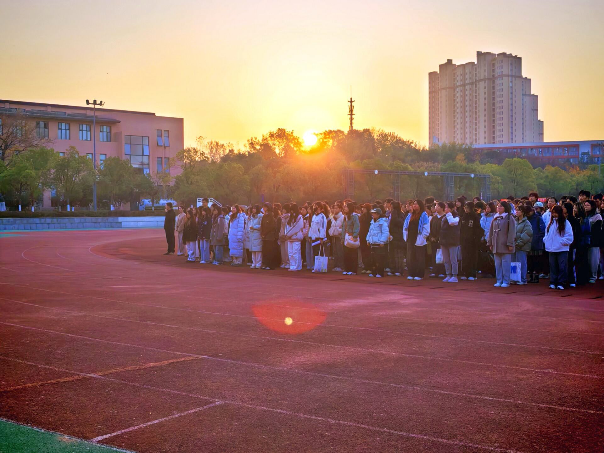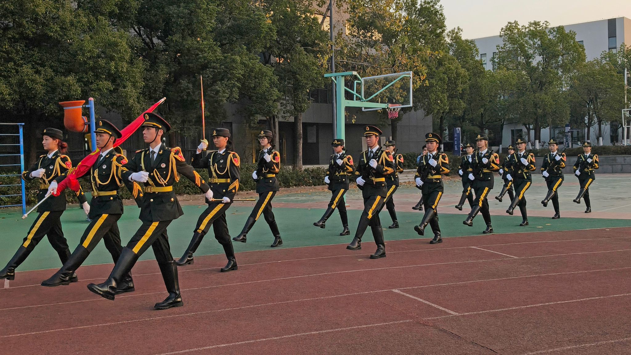 晨光微熹,升旗仪式开始。英姿飒爽的国旗护卫队队员们迈着铿锵有力、整齐划一的正步,护卫着鲜艳的五星红旗庄严地走向升旗台。鲜红的五星红旗在国歌声中冉冉升起,全体师生向国旗肃立凝视,将对祖国的热爱与忠诚融入这庄严的时刻。